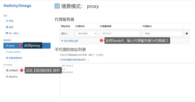 选择“proxy” → 选择“Socks5”代理 → 输入代理服务器、代理端口的信息 → 点击 “应用选项”,完成设置。