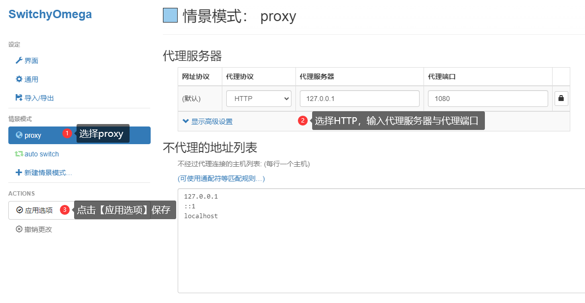 选择“proxy” → 选择“HTTP”代理 → 输入代理服务器、代理端口的信息 → 点击 “应用选项”,完成设置。
