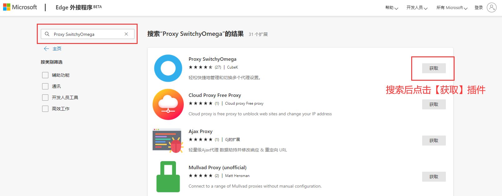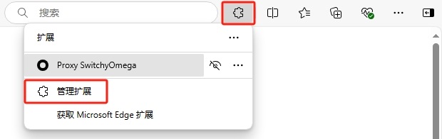 2、在 Edge 扩展商店中搜索并获取 Proxy SwitchyOmega 插件。
